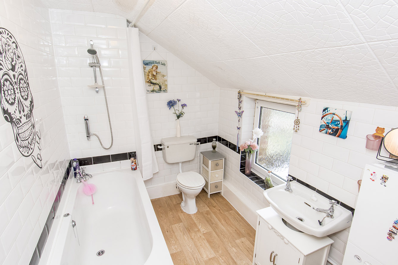 BATHROOM 7' 01" x 9' 02" (2.16m x 2.79m) Opaque side window, bath with overhead shower, toilet, sink, radiator, access to 3 year old boiler
