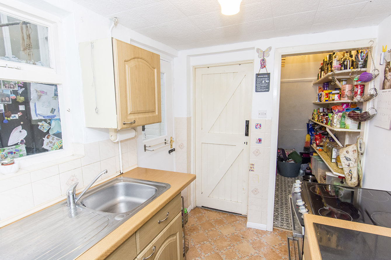 To the rear of the property, the kitchen is fitted with base-level cabinetry and benefits from a useful under stairs pantry cupboard, offering additional storage. A practical lean-to utility area completes the ground floor accommodation.