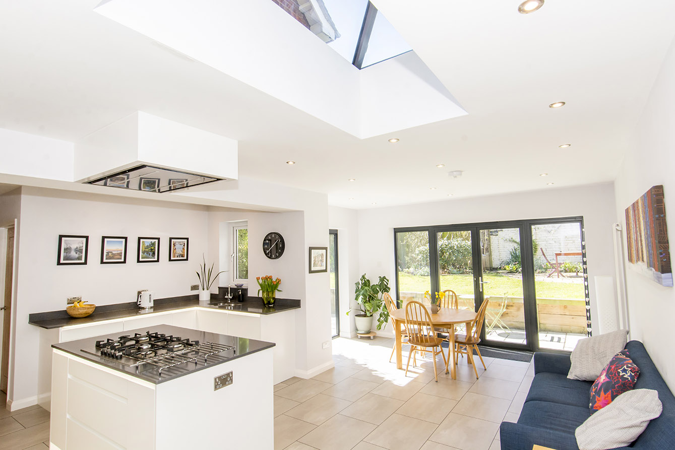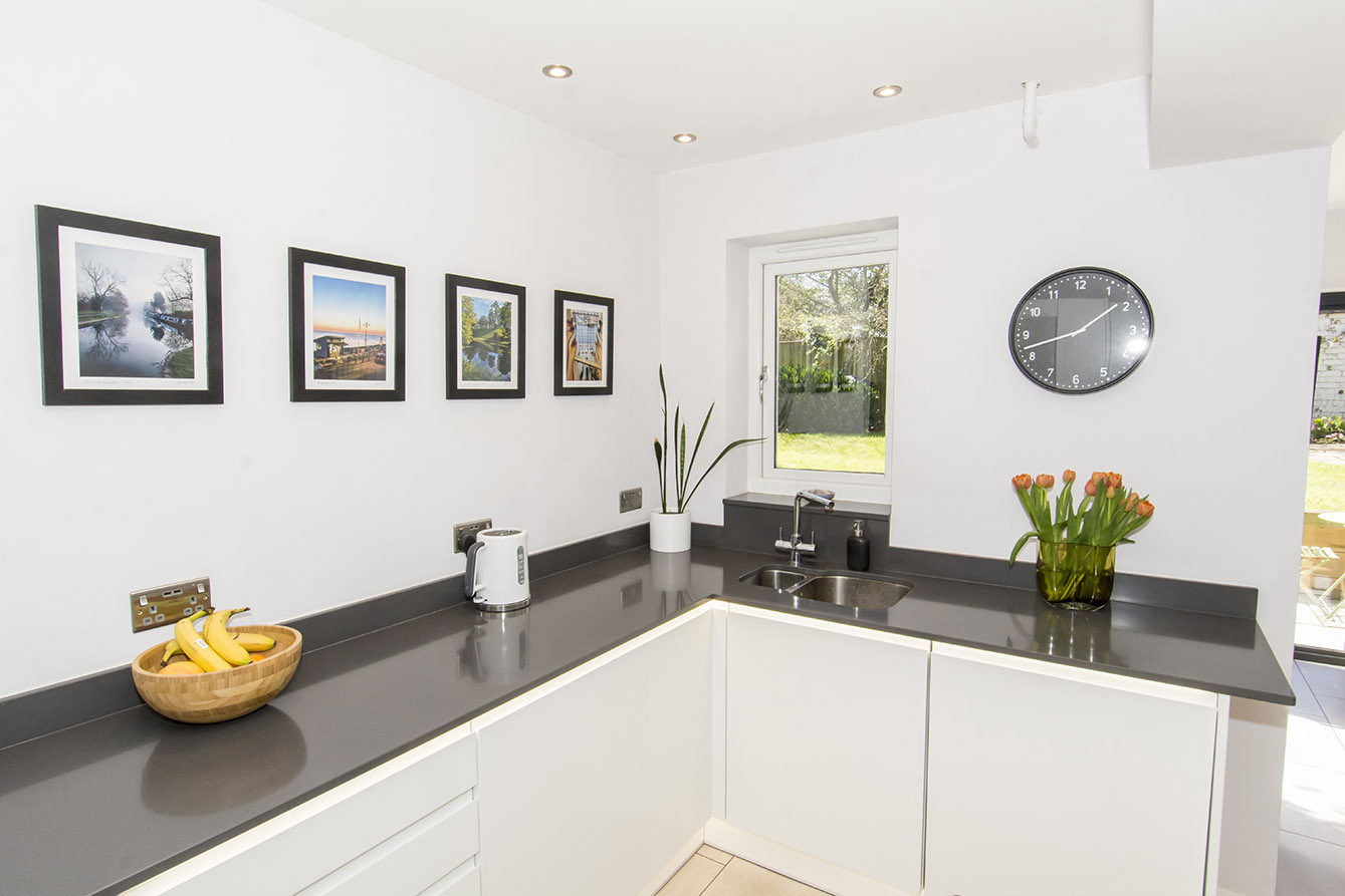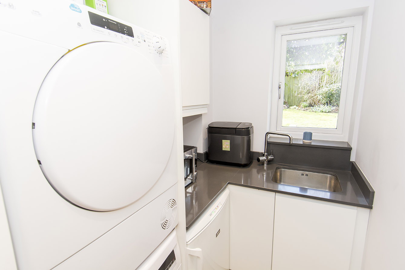 The kitchen/dining/living space is flooded with natural light thanks to a striking roof lantern, two windows, and glass patio doors opening onto the rear garden, this expansive space offers both style and functionality. Featuring sleek cabinetry, integrated appliances, and ample room for a dining and sitting area, it is ideal for both everyday living and entertaining. A useful utility room with plumbing for white goods and internal access to the garage provides added convenience.