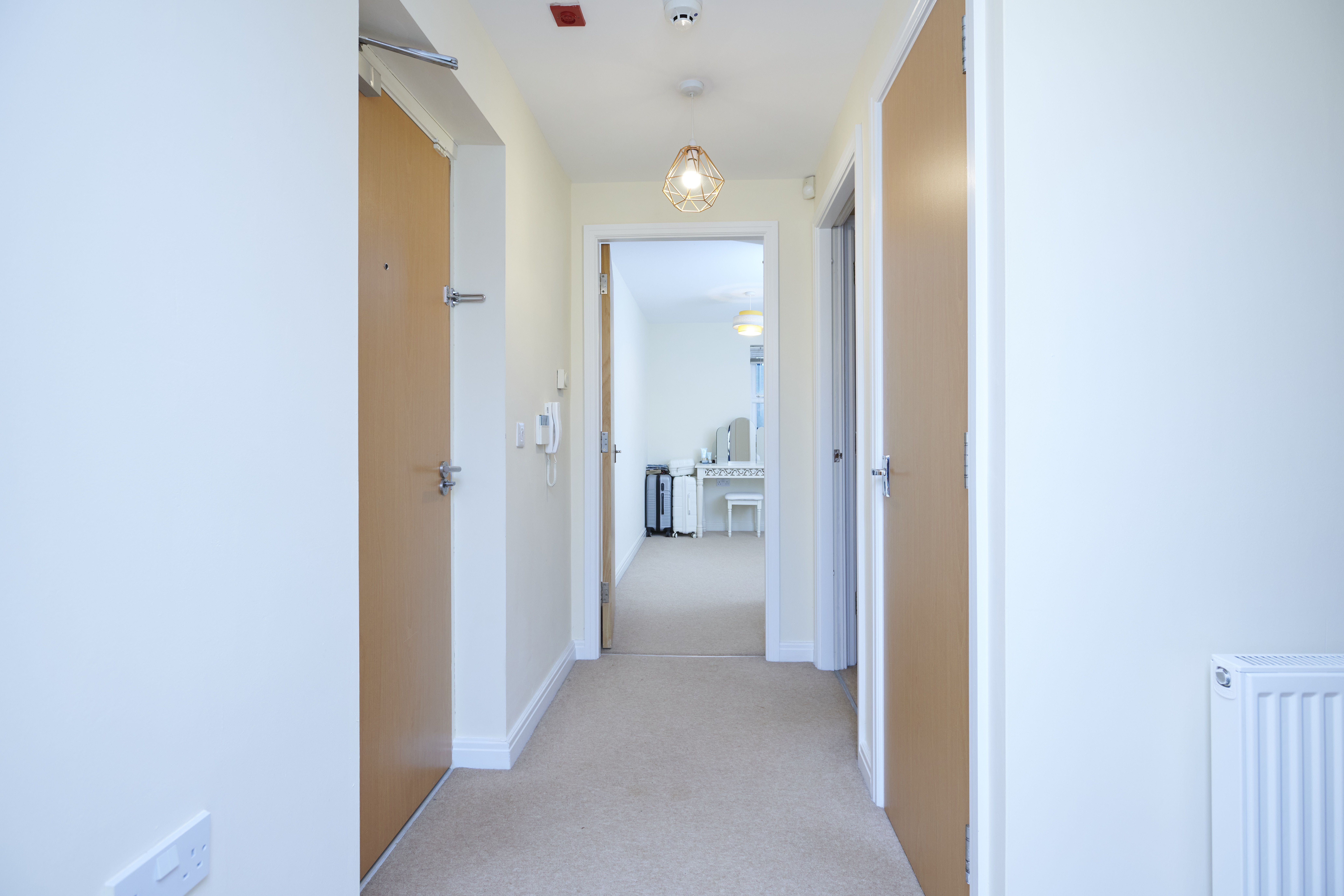 Entered through a secure communal doorway, the apartment is reached via stairs rising to the first floor. Stepping through the front door, you are greeted by a welcoming hallway complete with an intercom system and a useful storage cupboard, with all rooms leading from here.