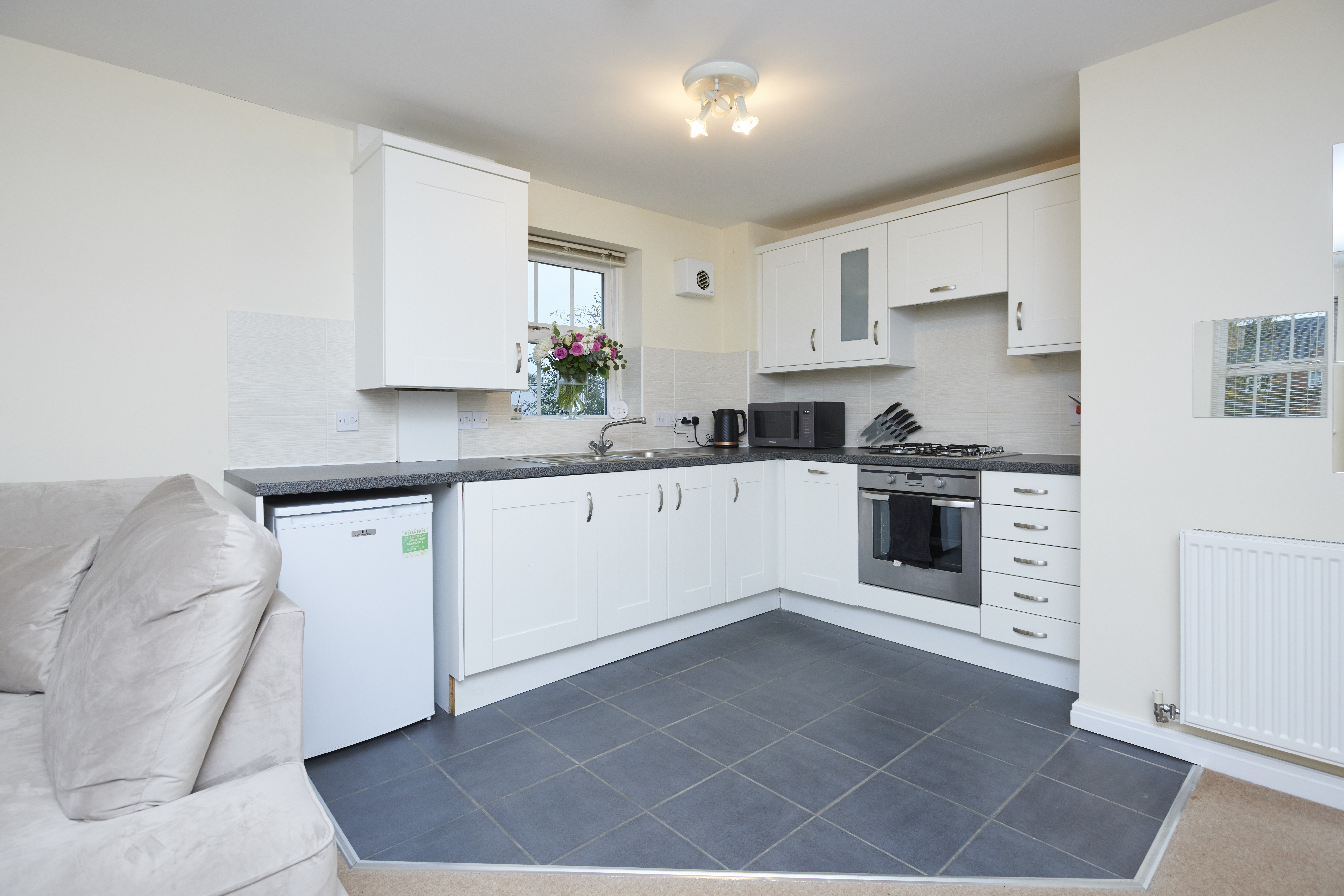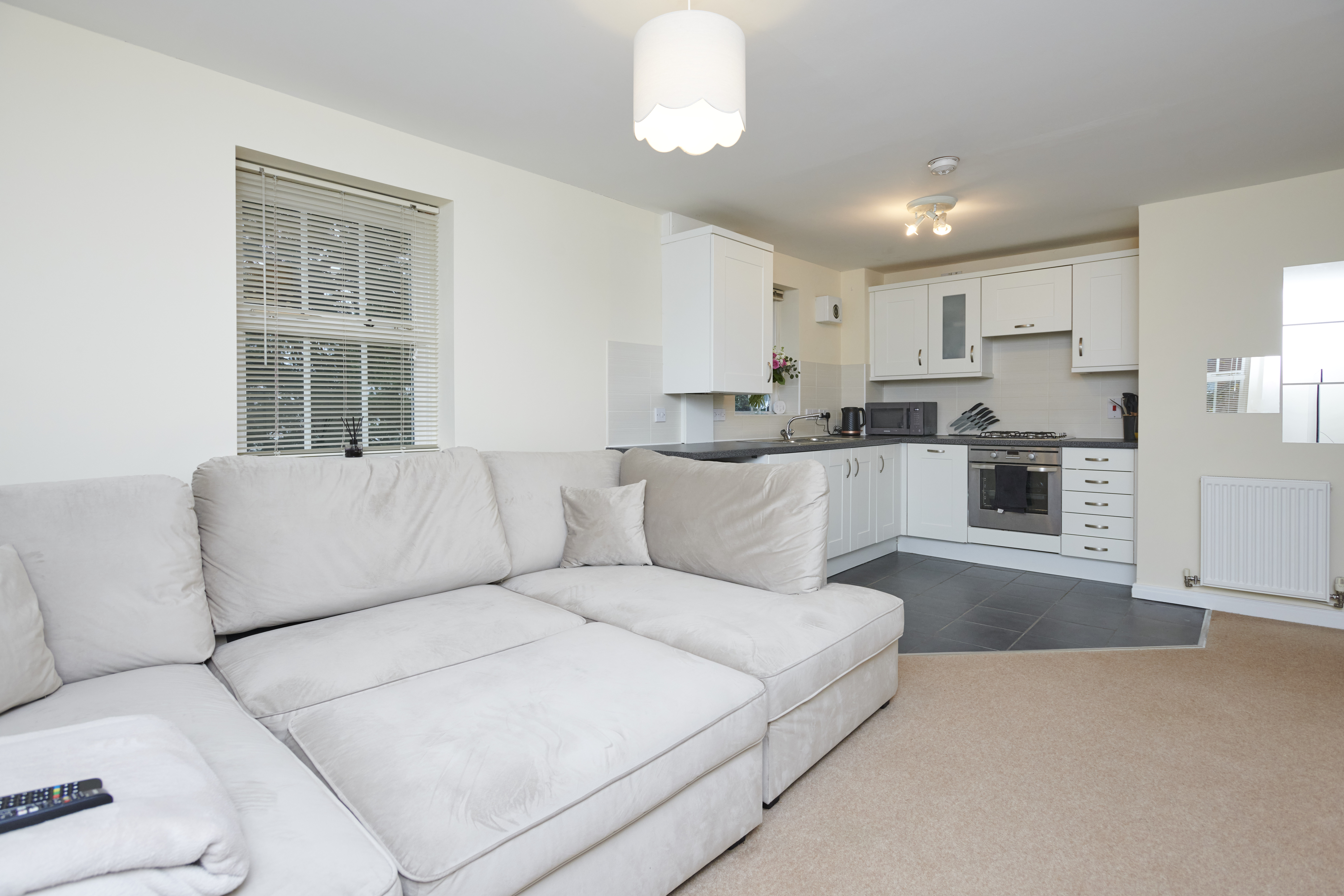 The spacious open-plan living area offers a versatile layout for both lounging and dining. The modern kitchen is fitted with a range of base and eye-level units along with integrated appliances, creating an attractive and functional space for everyday living.