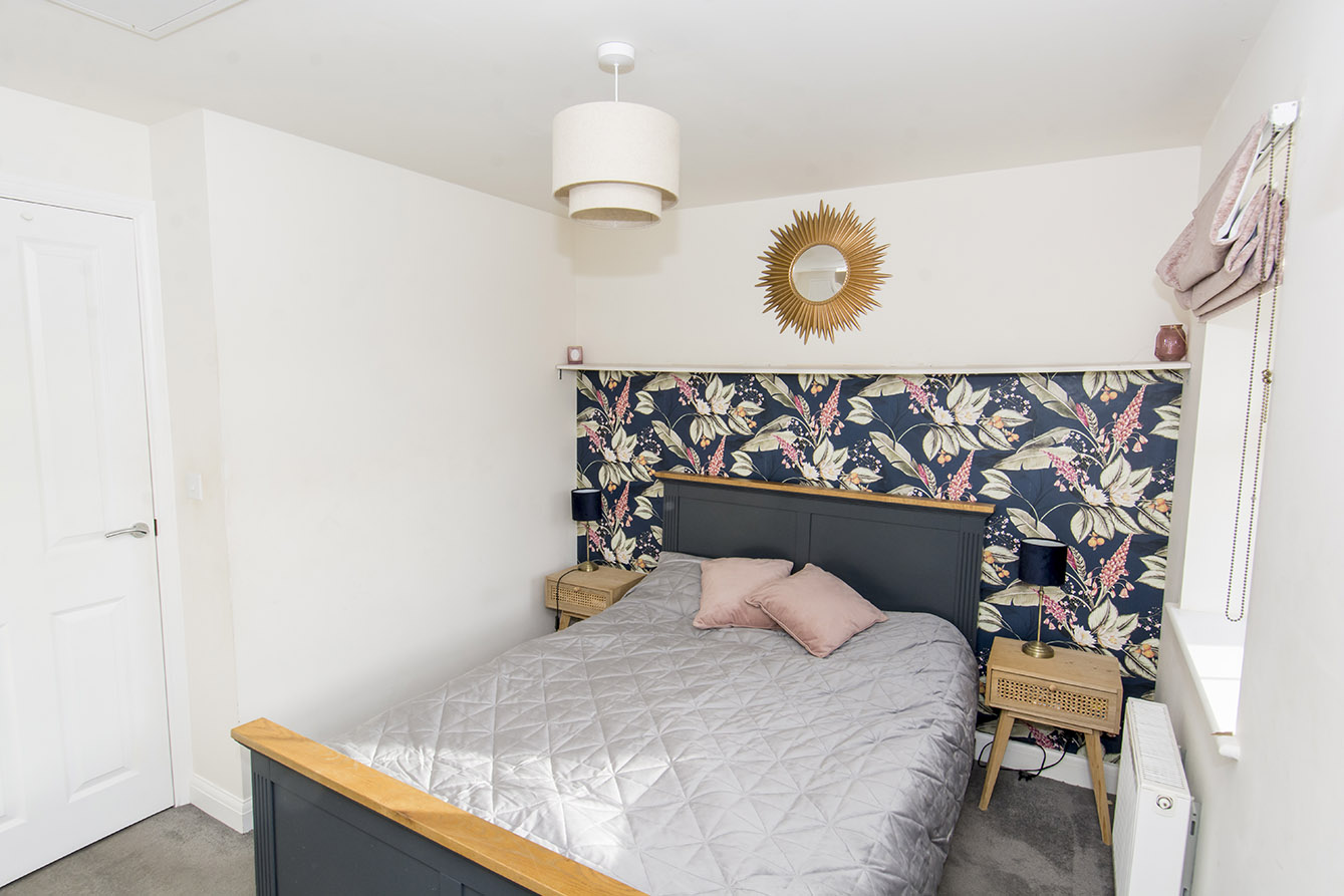 Upstairs, the property offers two well-proportioned bedrooms, both benefiting from dual windows. The main bedroom further benefits from a built-in storage cupboard. A modern bathroom serves the first floor.
