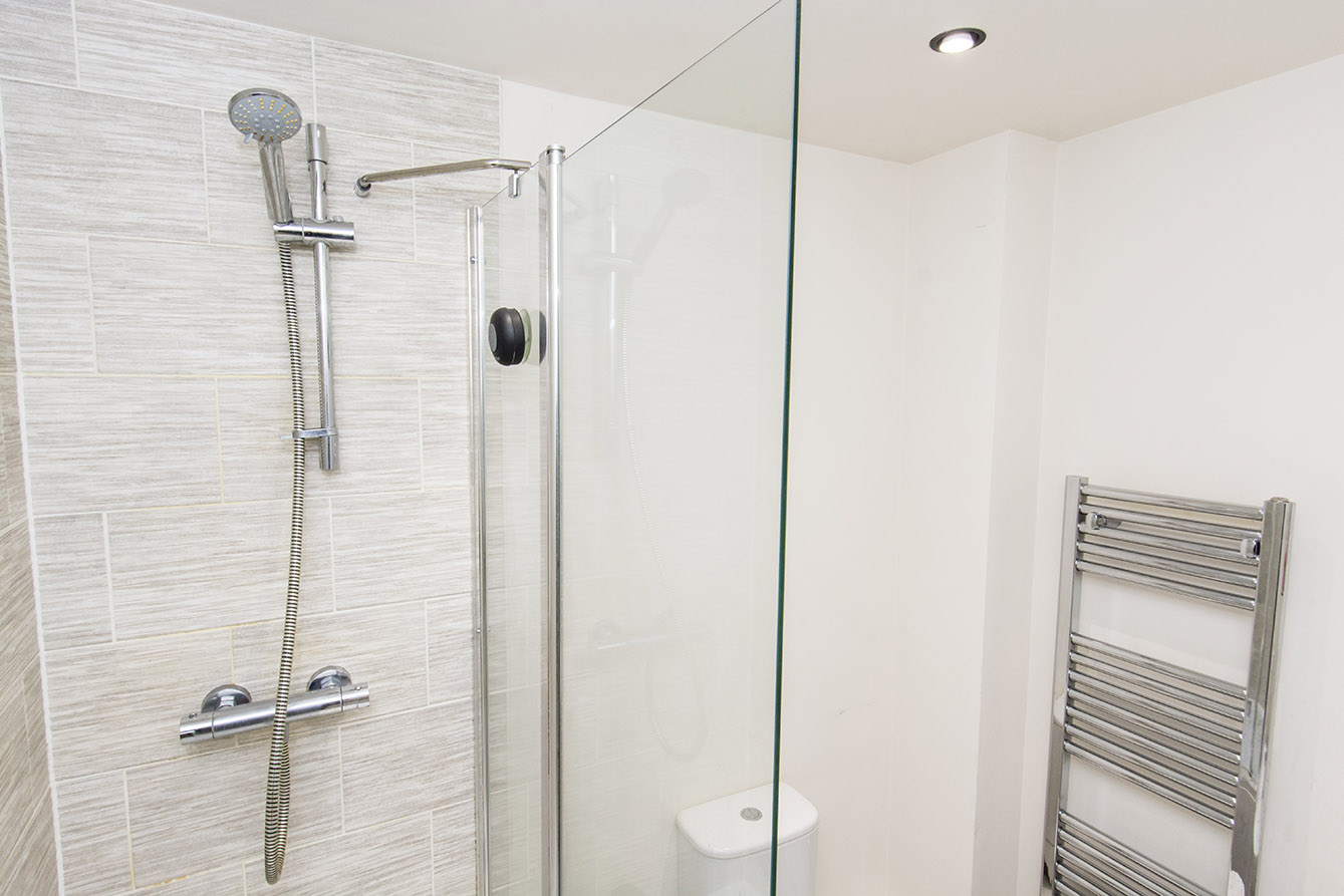 BATHROOM 5' 06" x 6' 02" (1.68m x 1.88m) Ceiling extractor fan, bath with overhead shower, toilet, sink, chrome heated towel rail.