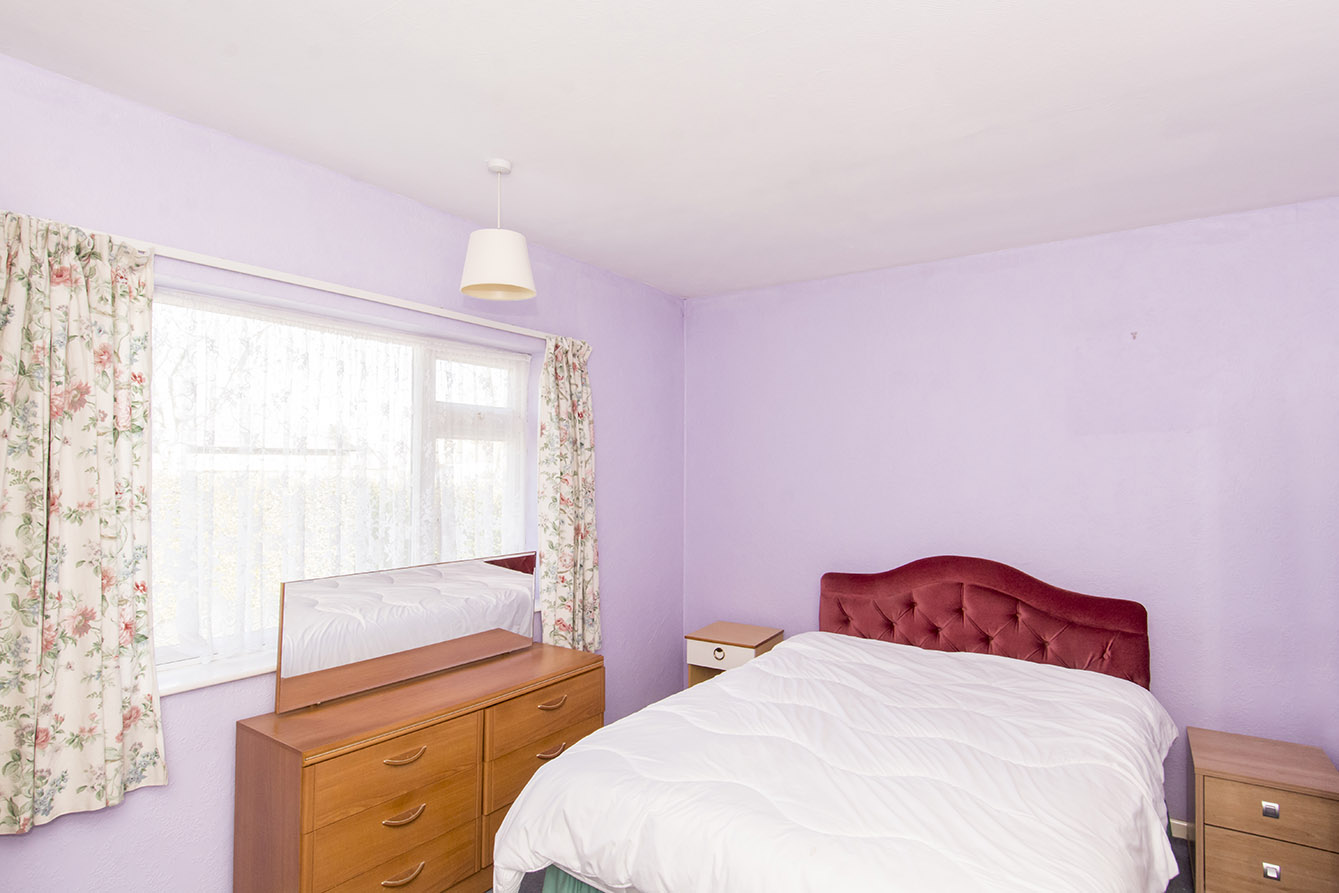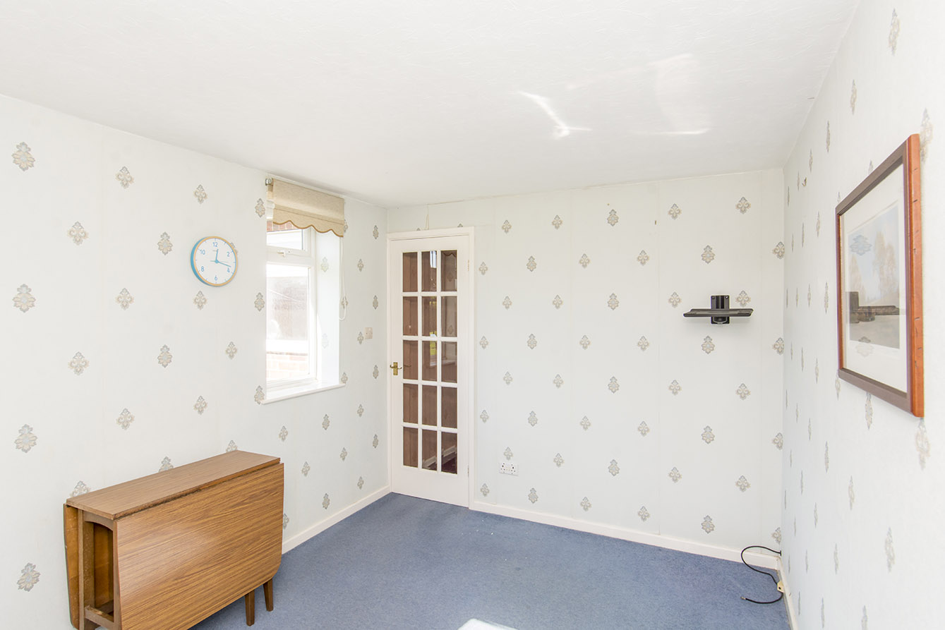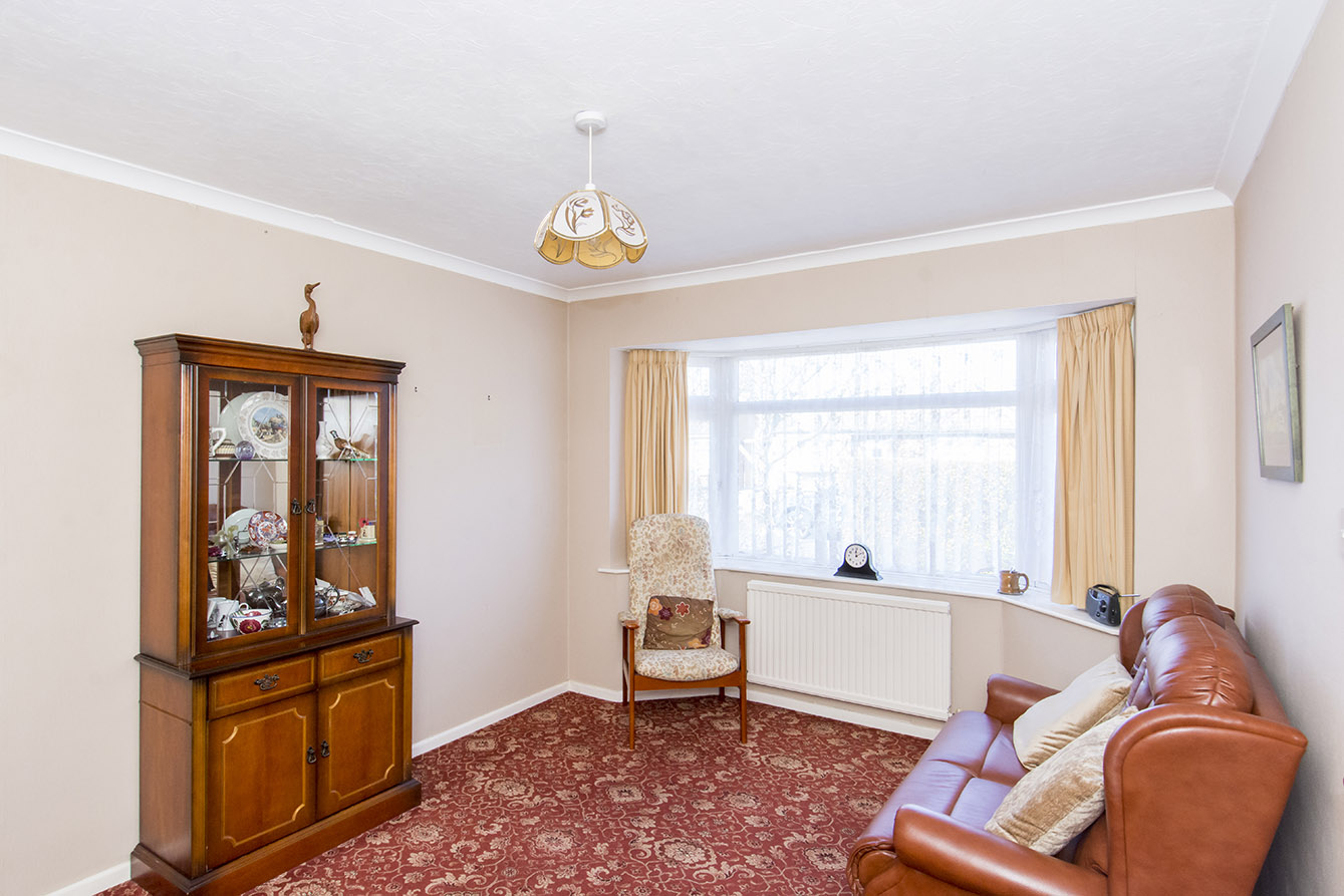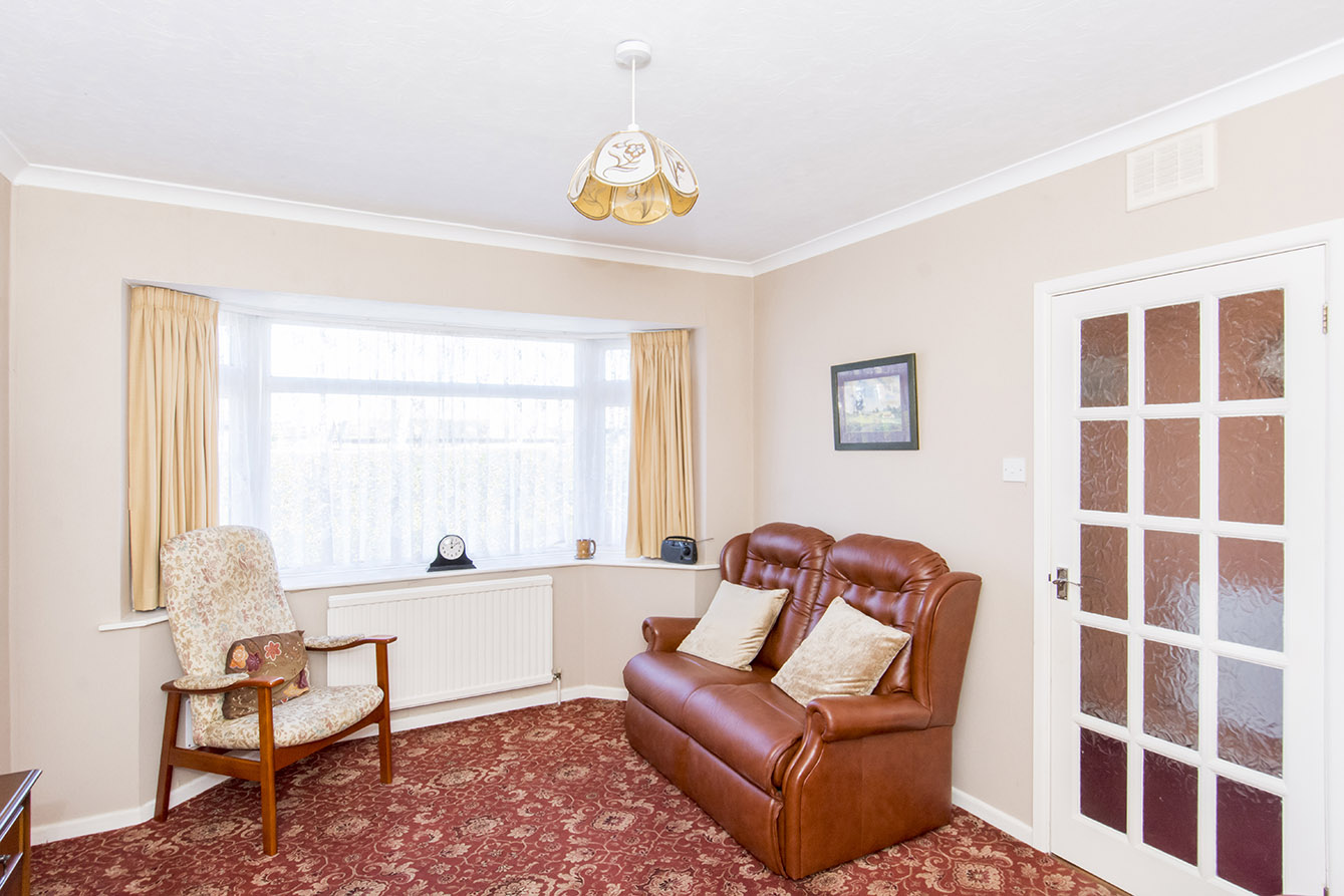 Internally, the accommodation is arranged around a central hallway, providing access to all rooms. The bright and airy lounge is positioned to the front of the property and features a large bay window, allowing natural light to flood the space. The kitchen is located to the rear, with convenient side access leading directly out to the garden.