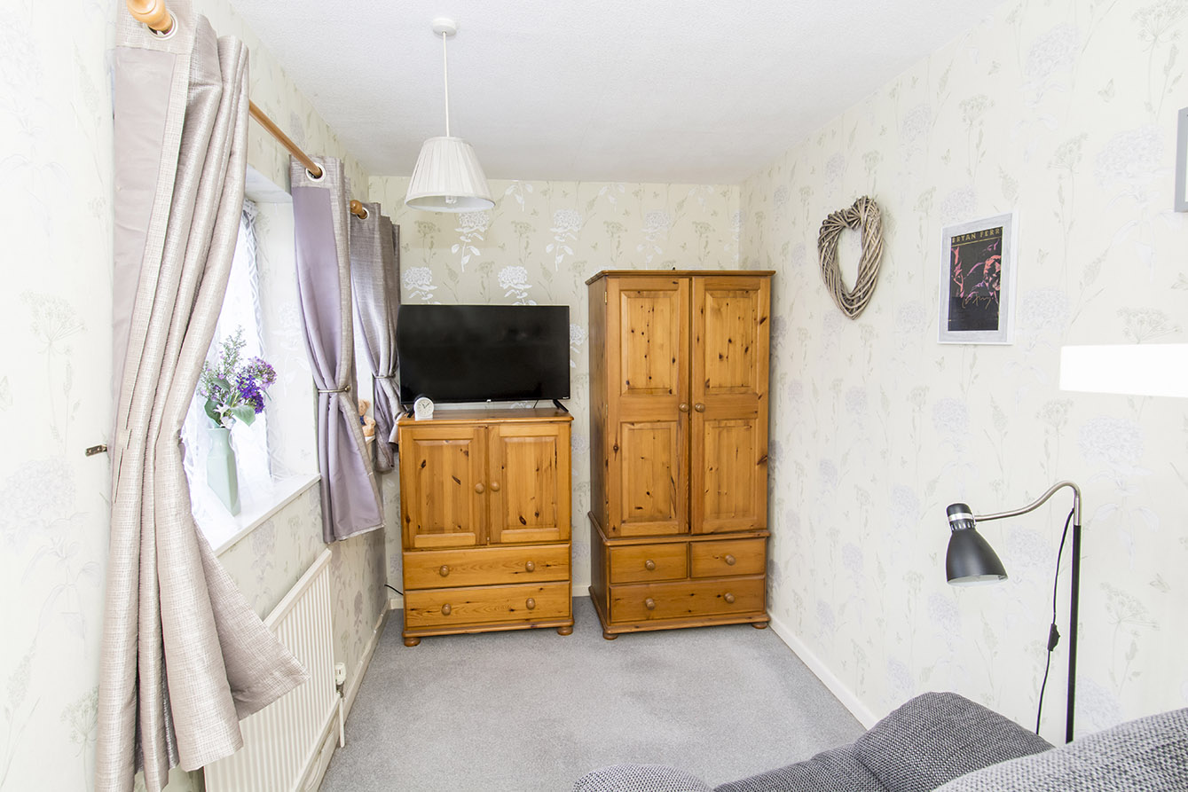 BEDROOM THREE 14' 00" x 6' 09" (4.27m x 2.06m) Two front windows, storage cupboard, radiator.