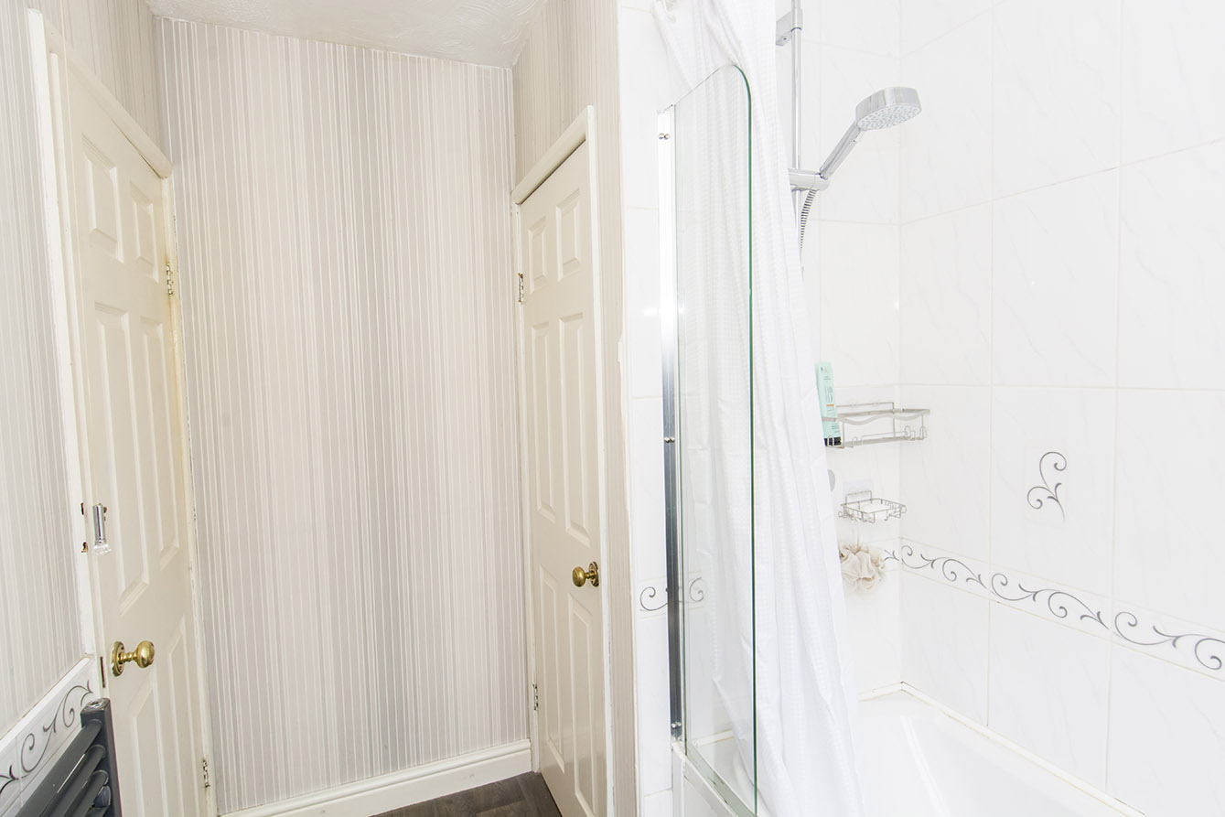 BATHROOM 5' 10" x 8' 05" (1.78m x 2.57m) Opaque front window, bath with overhead shower, sink, toilet, airing cupboard, heated towel rail.