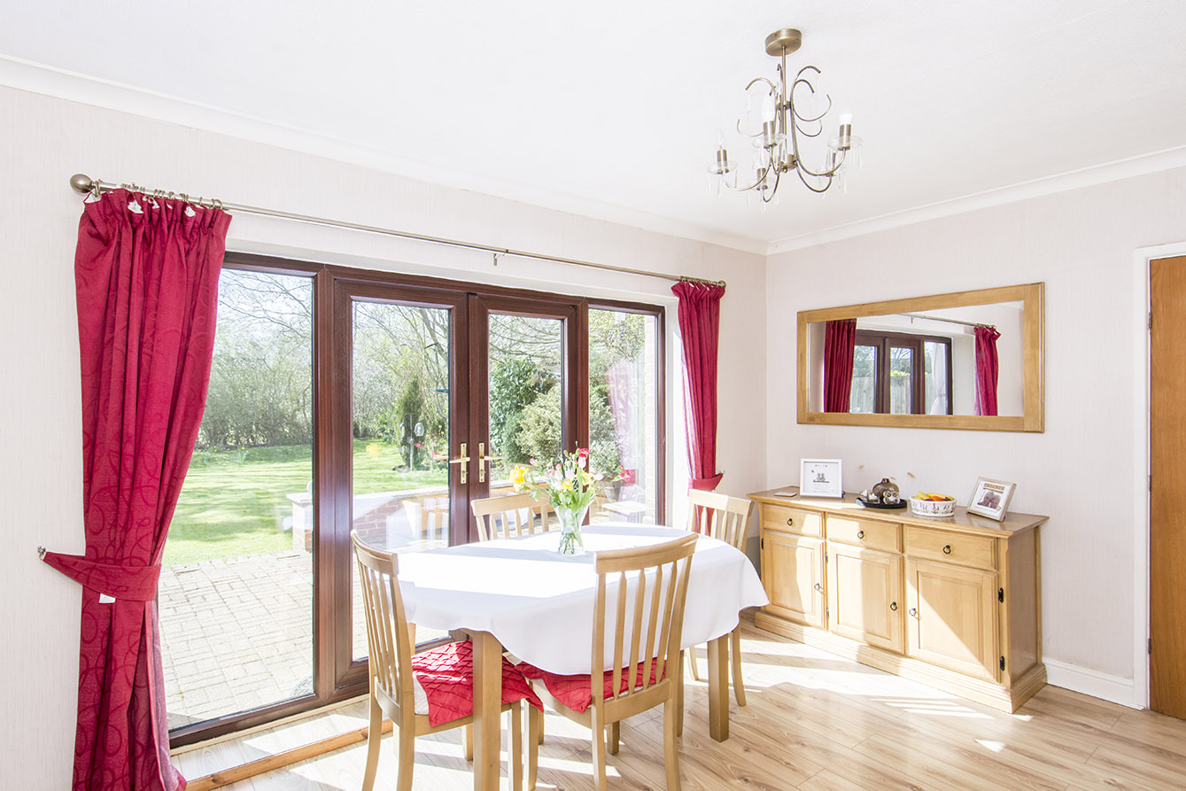 The dining room is a bright and inviting space, featuring French patio doors that open onto the garden, allowing natural light to flood the room. Leading from the dining area is a practical utility room, offering additional units and further space for appliances.