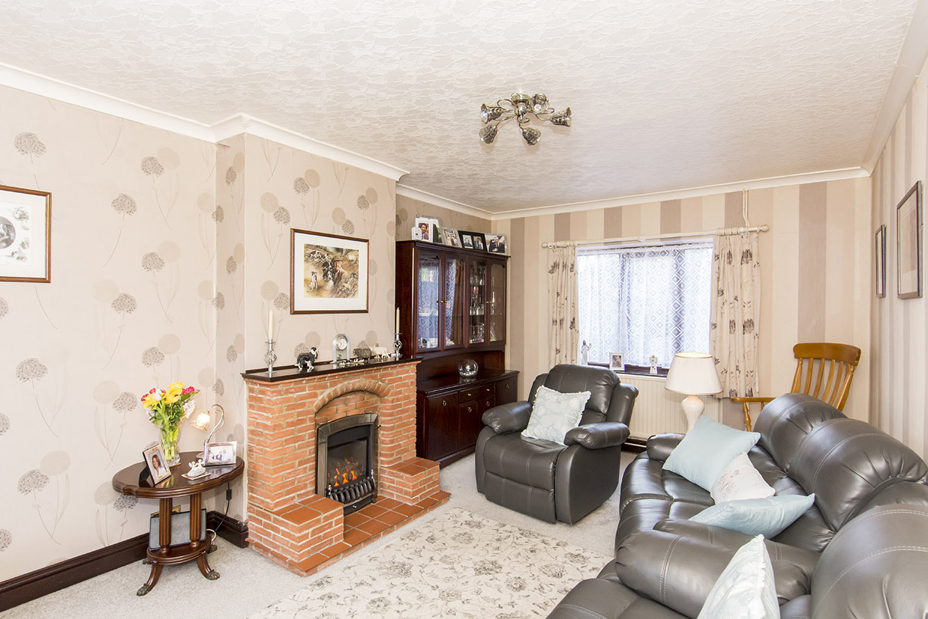 LOUNGE 10' 11" x 17' 01" (3.33m x 5.21m) Front window, rear window, brick fireplace with gas fire, two radiators.