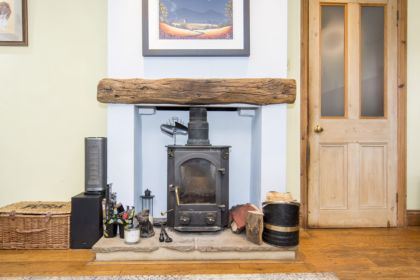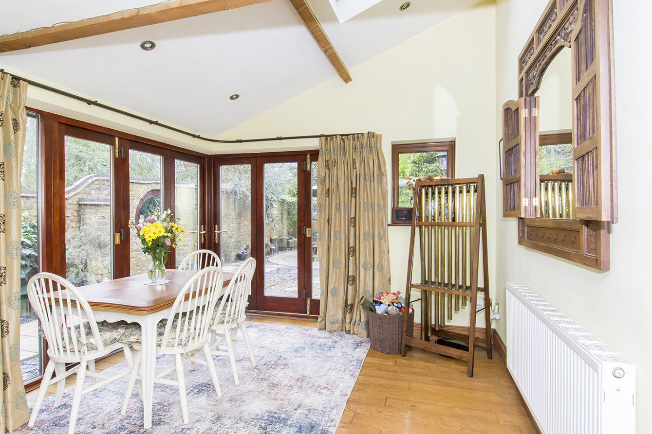 To the right-hand side of the property lies the impressive lounge/diner, a bright and spacious area ideal for both relaxing and entertaining. A feature fireplace with a log burner and timber mantle creates a cosy focal point, while two sets of bi-fold doors meet at the corner, opening fully to provide a seamless transition to the courtyard garden.