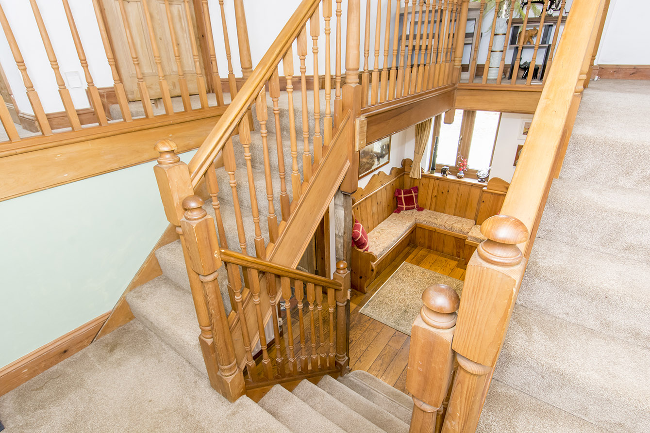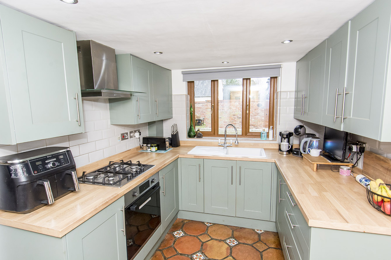 Upon entering the property, you are welcomed into a spacious hallway featuring a striking central staircase rising to a galleried first-floor landing. A thoughtfully designed built-in corner bench with integrated storage adds both practicality and charm. The kitchen, accessed directly from the hallway, is fitted with an attractive range of shaker-style base and eye-level units, complemented by integrated appliances.