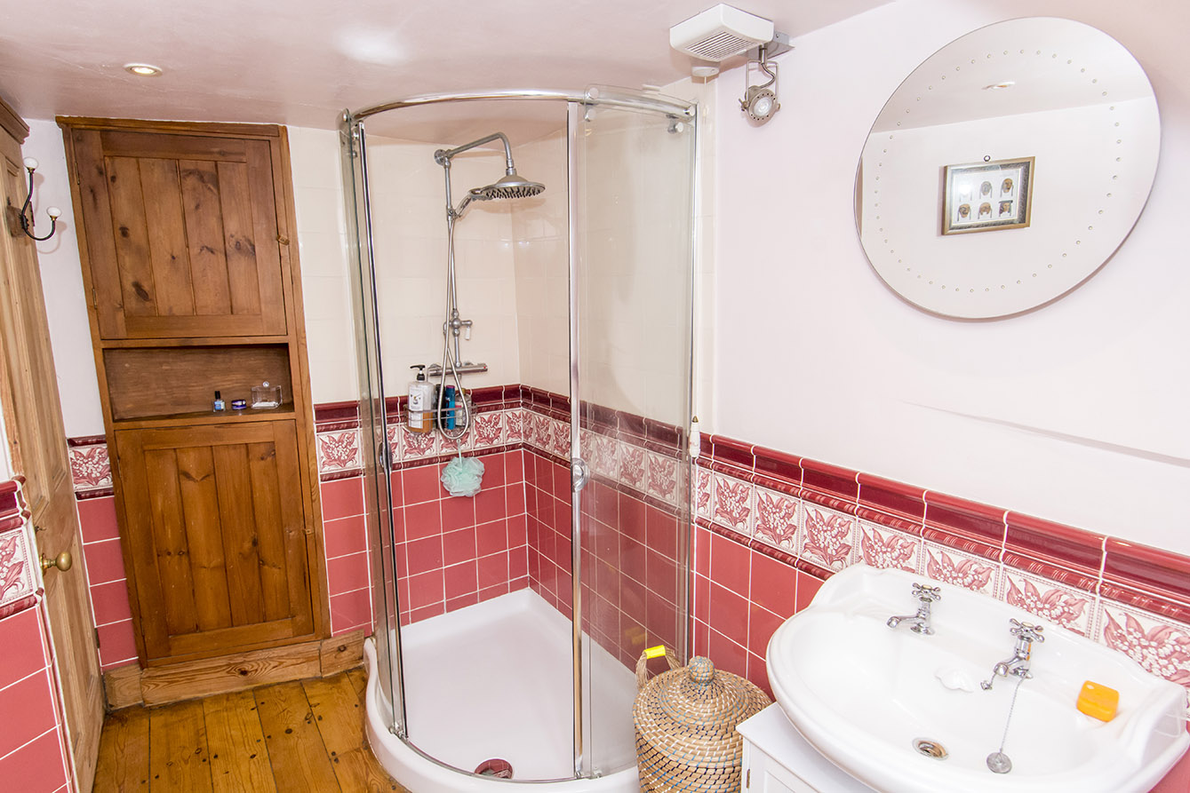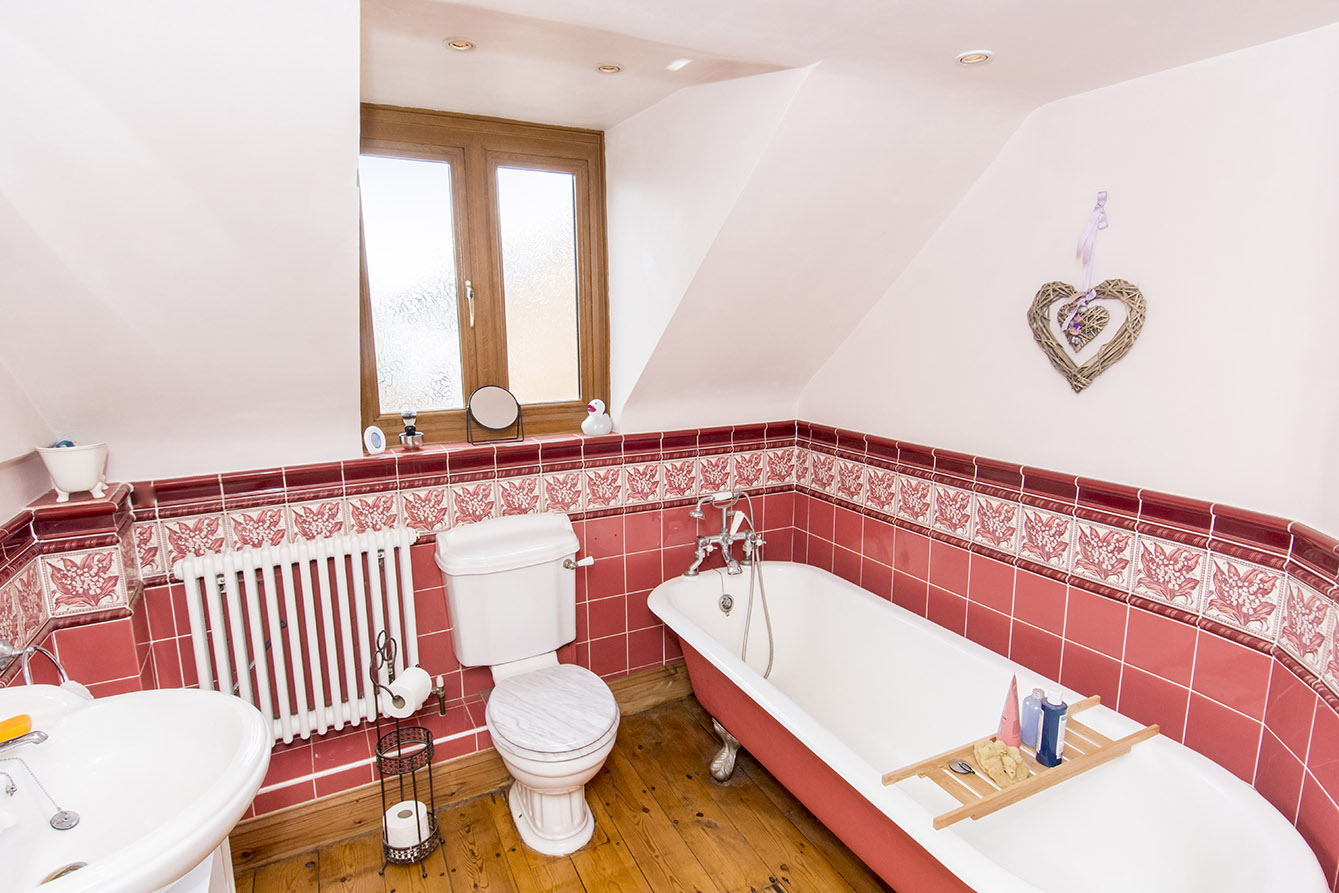 BATHROOM 7' 11" x 10' 05" (2.41m x 3.18m) Front opaque window, corner shower, freestanding bath, sink, toilet, storage cupboard, radiator.