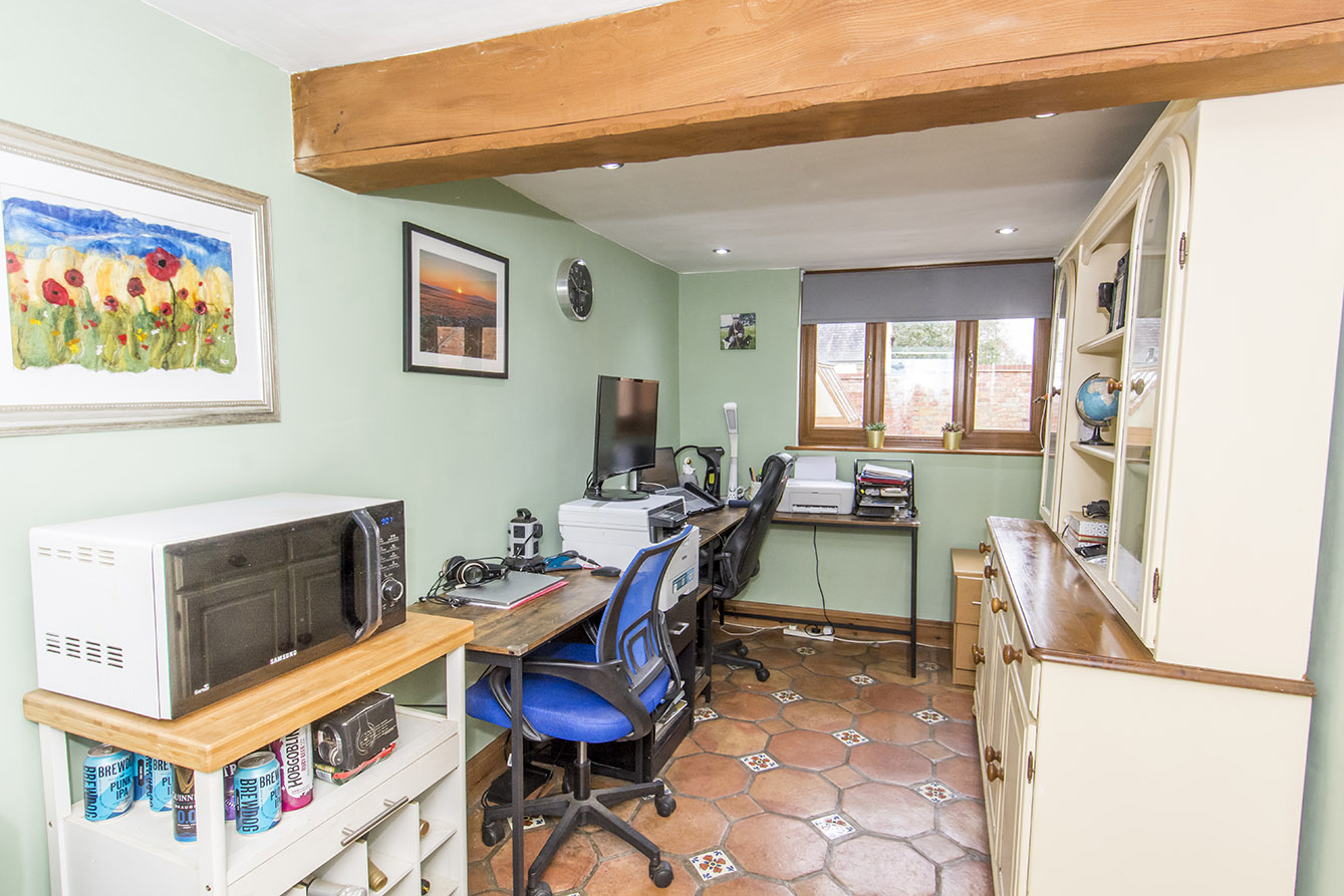 Leading off the kitchen is a useful utility/WC and a versatile reception room, currently utilised as a study. This room also provides internal access to the integrated single garage, offering excellent convenience.