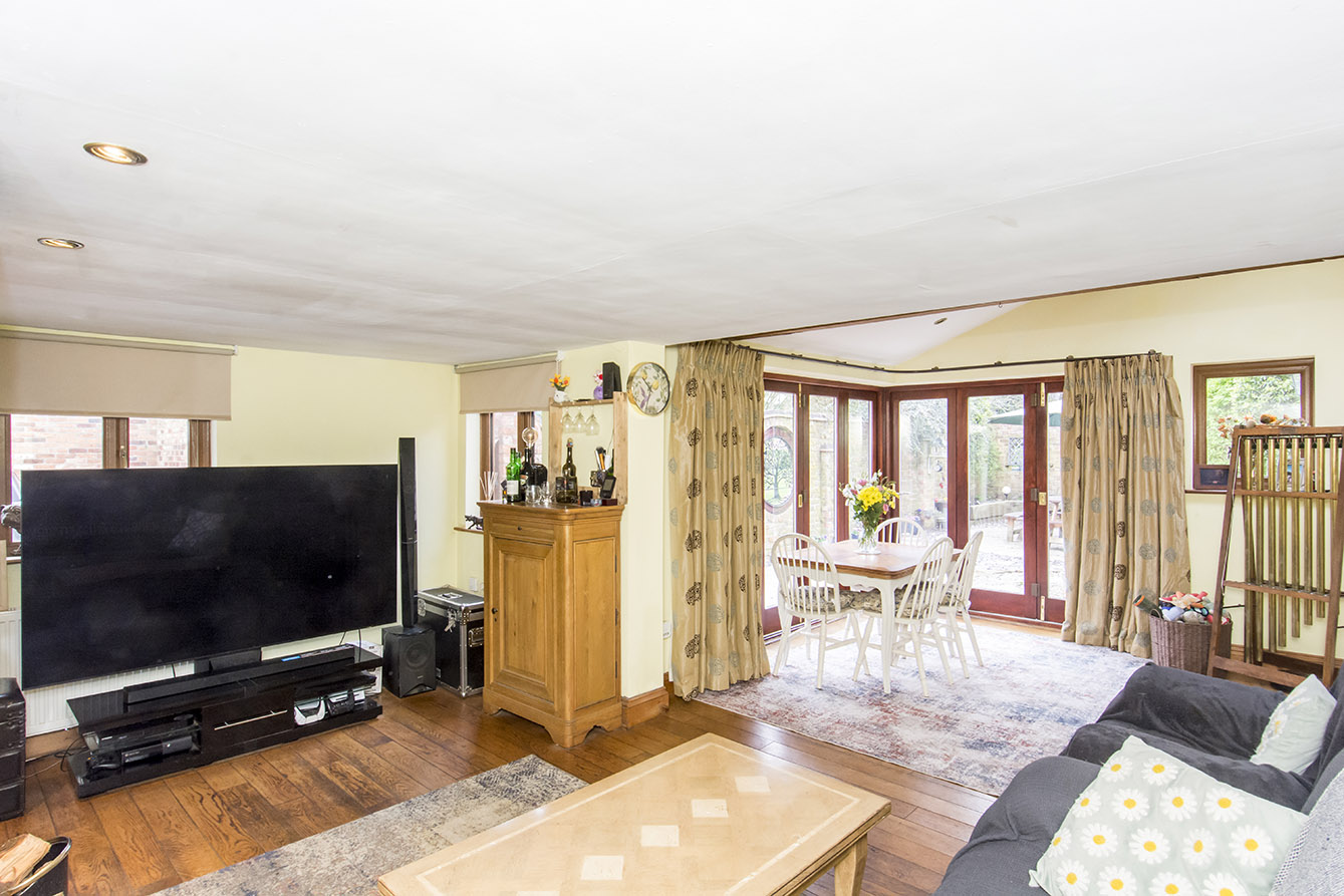 LOUNGE/DINER 21' 10" x 16' 01" (6.65m x 4.9m) Corner bifold doors opening onto the garden, front window, side window, log burner, three radiators.