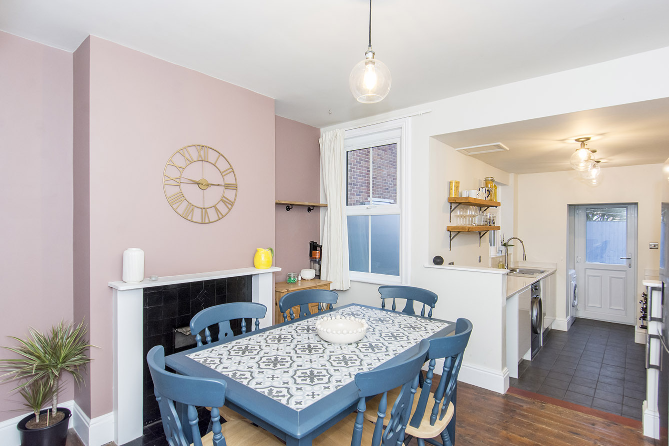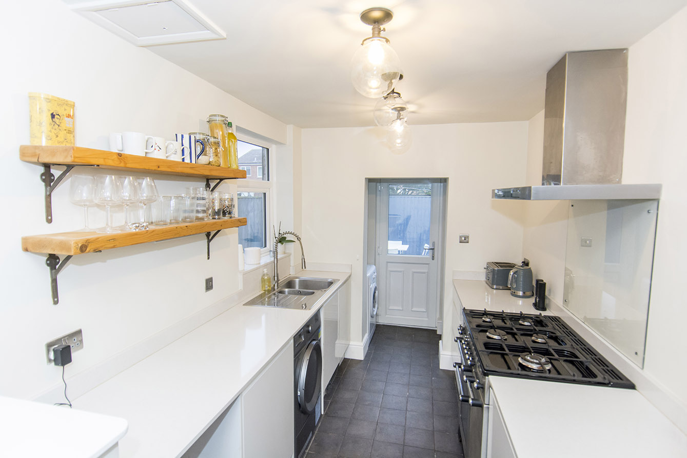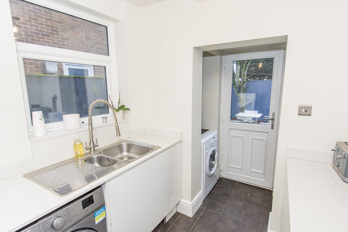 To the rear of the property lies the kitchen, fitted with sleek base-level cabinetry, a range cooker, and a one-and-a-half bowl stainless steel sink. Beyond the kitchen is a useful utility area housing the boiler, with space for a washing machine and a rear door providing direct access to the garden.