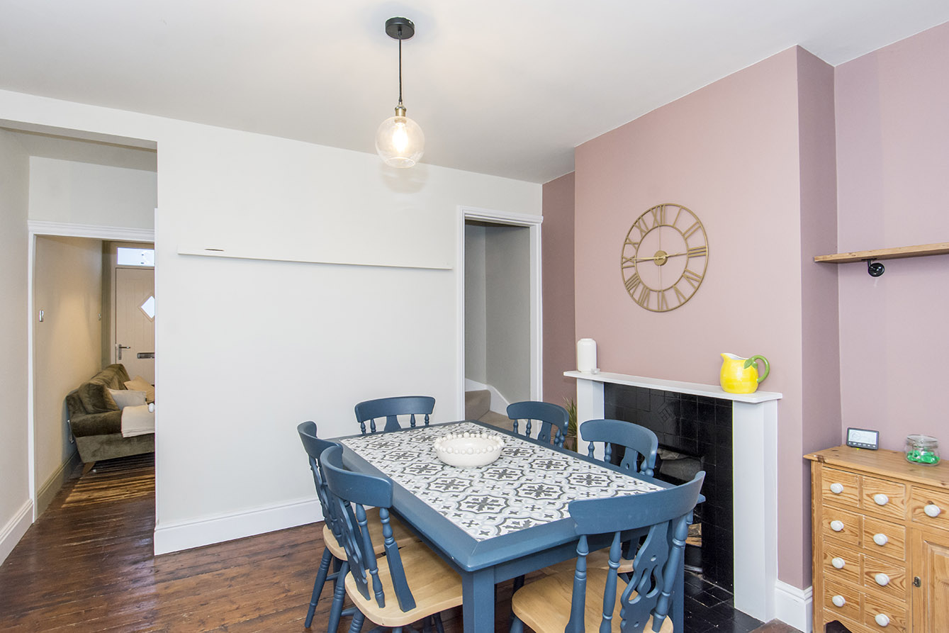 The front door opens into a welcoming living room, rich in period features including high ceilings, a large bay window that floods the space with natural light, a decorative fireplace, and attractive hardwood flooring. A doorway leads through to the dining room, where the hardwood flooring continues, creating a cohesive and versatile space ideal for entertaining. From here, there is access to both the stairs to the cellar and first floor.