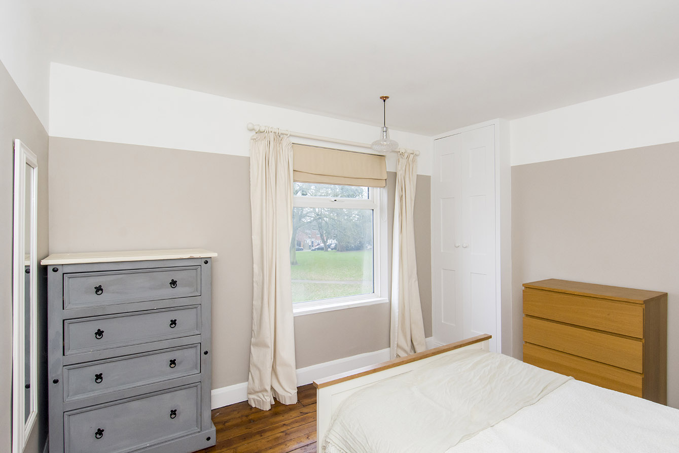 BEDROOM ONE 13' 05" x 11' 00" (4.09m x 3.35m) Front window, built-in wardrobe, access to loft room, radiator.