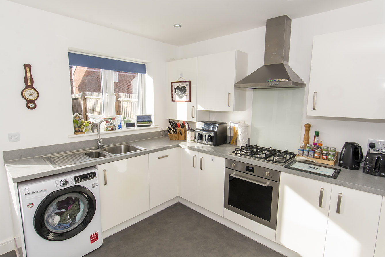 Upon entering, you're welcomed into a bright entrance hall with stairs rising to the first floor and a door leading into the spacious lounge. To the rear, the kitchen/diner enjoys an abundance of natural light through its large window and glass-panelled door, opening out to the garden. The kitchen is well-appointed with a range of base and eye-level units, along with integrated appliances including a dishwasher and fridge/freezer. A ground-floor WC adds further practicality.
