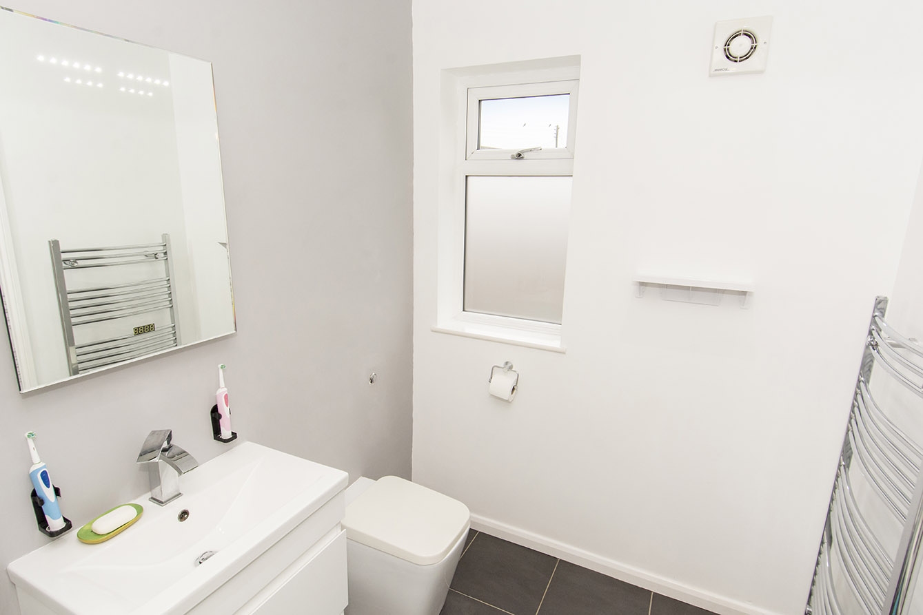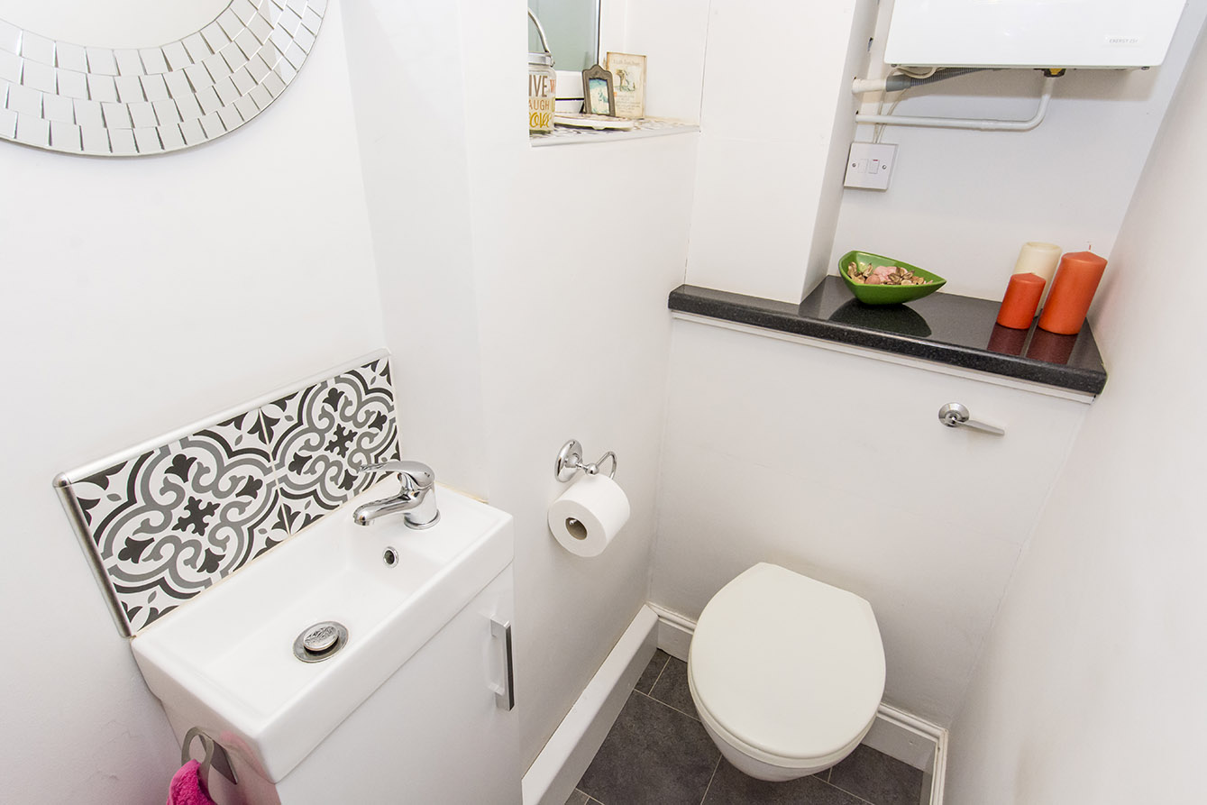 WC 6' 04" x 3' 00" (1.93m x 0.91m) Opaque side window, sink unit with storage, toilet, radiator.