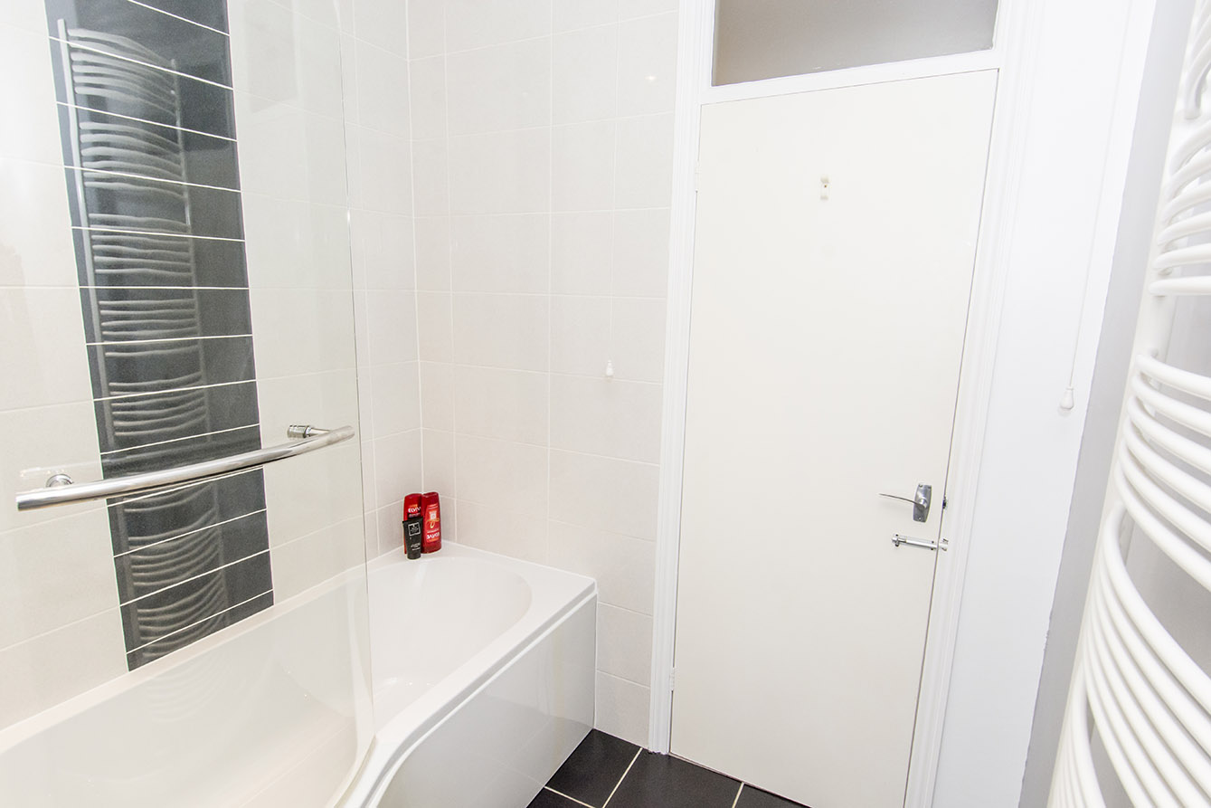 BATHROOM 12' 01" x 6' 05" (3.68m x 1.96m) Opaque side window, bath with overhead shower, toilet, sink unit with storage, heated towel rail.