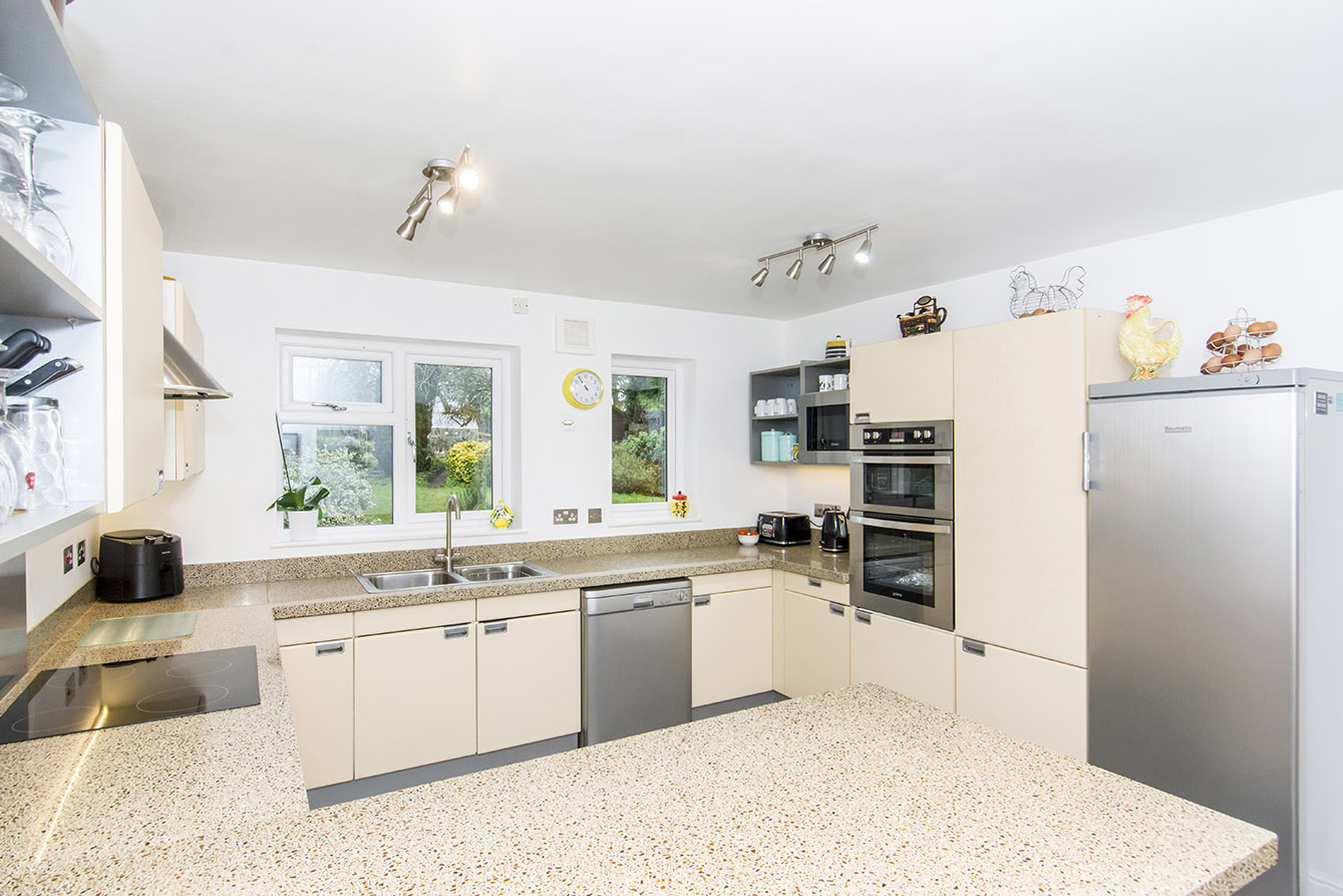 From the hallway, you are drawn into the spacious living/dining room, which enjoys a central fireplace with log burner, dual-aspect windows, and sliding doors that open seamlessly onto the rear garden.