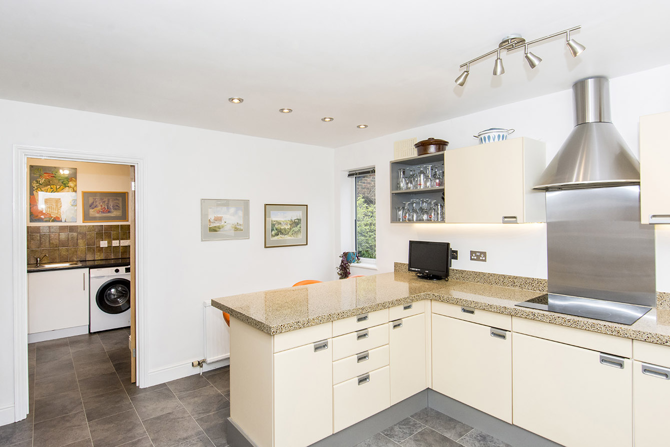 The kitchen is well-appointed with a range of base and eye-level units, integrated appliances, and three windows, ensuring a light and airy feel throughout. Leading off the kitchen is a generously sized utility room, providing additional storage and workspace, along with a second porch, convenient coal storage cupboard, and a ground-floor WC.