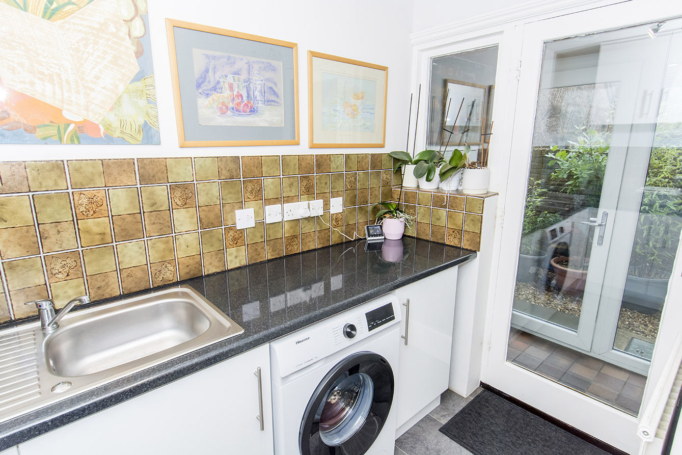 UTILITY ROOM 8' 08" x 8' 04" (2.64m x 2.54m) Side window and door, undercounter space for white goods, stainless steel sink with drainage board, radiator.